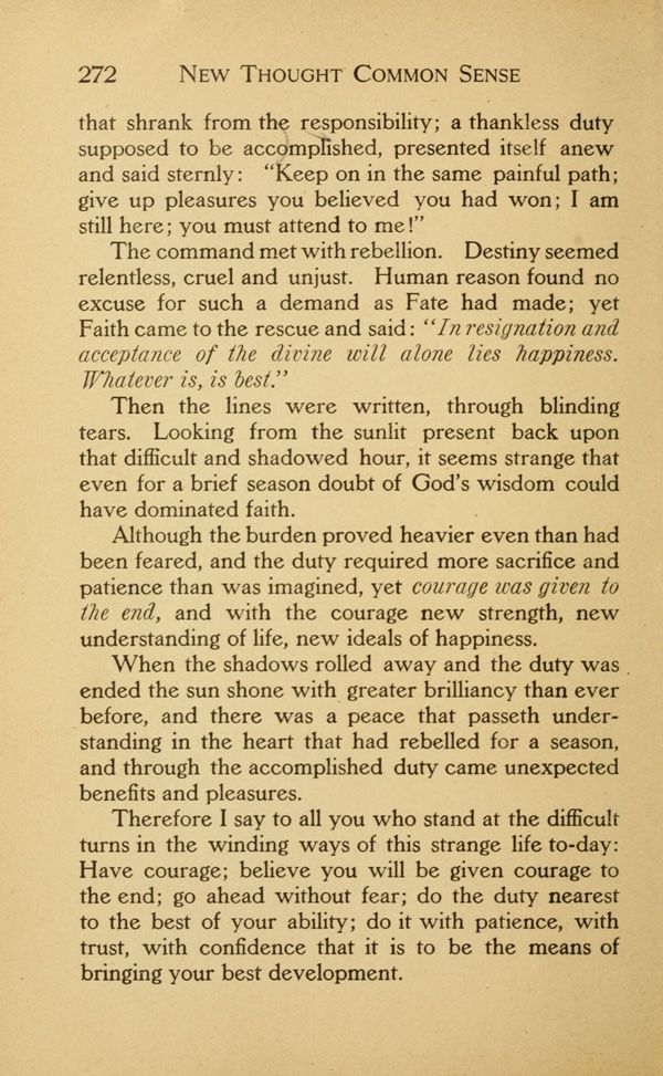 Therefore I say to all you who stand at the difficult turns in the winding ways of this strange life to-day: Have courage; believe you will be given courage to the end; go ahead without fear; do the duty nearest to the best of your ability; do it with patience, with trust, with confidence that it is to be the means of bringing your best development.