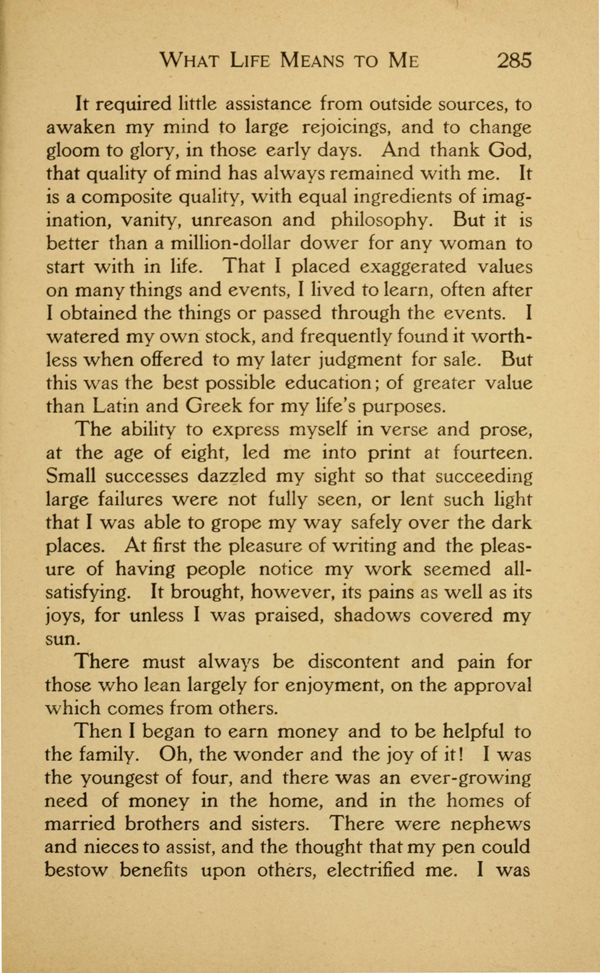 Then I began to earn money and to be helpful to the family. Oh, the wonder and the joy of it! I was the youngest of four, and there was an ever-growing need of money in the home, and in the homes of married brothers and sisters. There were nephews and nieces to assist, and the thought that my pen could bestow benefits upon others, electrified me. I was