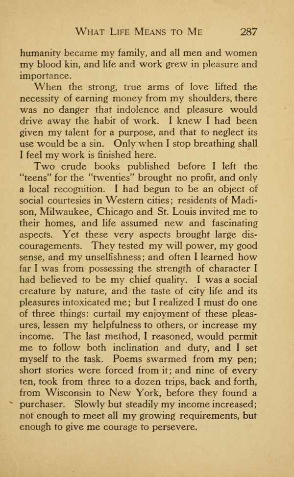 Two crude books published before I left the "teens" for the "twenties" brought no profit, and only a local recognition. I had begun to be an object of social courtesies in Western cities; residents of Madison, Milwaukee, Chicago and St. Louis invited me to their homes, and life assumed new and fascinating aspects. Yet these very aspects brought large discouragements. They tested my will power, my good sense, and my unselfishness; and often I learned how far I was from possessing the strength of character I had believed to be my chief quality. I was a social creature by nature, and the taste of city life and its pleasures intoxicated me; but I realized I must do one of three things: curtail my enjoyment of these pleasures, lessen my helpfulness to others, or increase my income. The last method, I reasoned, would permit me to follow both inclination and duty, and I set myself to the task. Poems swarmed from my pen; short stories were forced from it; and nine of every ten, took from three to a dozen trips, back and forth, from Wisconsin to New York, before they found a purchaser. Slowly but steadily my income increased; not enough to meet all my growing requirements, but enough to give me courage to persevere.