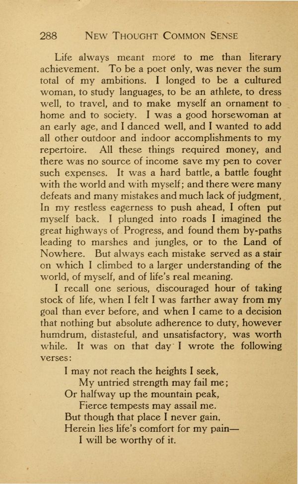 Life always meant more to me than literary achievement. To be a poet only, was never the sum total of my ambitions. I longed to be a cultured woman, to study languages, to be an athlete, to dress well, to travel, and to make myself an ornament to home and to society. I was a good horsewoman at an early age, and I danced well, and I wanted to add all other outdoor and indoor accomplishments to my repertoire. All these things required money, and there was no source of income save my pen to cover such expenses. It was a hard battle, a battle fought with the world and with myself; and there were many defeats and many mistakes and much lack of judgment, In my restless eagerness to push ahead, I often put myself back. I plunged into roads I imagined the great highways of Progress, and found them by-paths leading to marshes and jungles, or to the Land of Nowhere. But always each mistake served as a stair on which I climbed to a larger understanding of the world, of myself, and of life's real meaning.