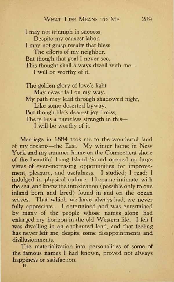 Marriage in 1884 took me to the wonderful land of my dreams --- the East. My winter home in New York and my summer home on the Connecticut shore of the beautiful Long Island Sound opened up large vistas of ever-increasing opportunities for improvement, pleasure, and usefulness. I studied; I read; I indulged in physical culture; I became intimate with the sea, and knew the intoxication (possible only to one inland born and bred) found in and on the ocean waves. That which we have always had, we never fully appreciate. I entertained and was entertained by many of the people whose names alone had enlarged my horizon in the old Western life. I felt I was dwelling in an enchanted land, and that feeling has never left me, despite some disappointments and disillusionments.