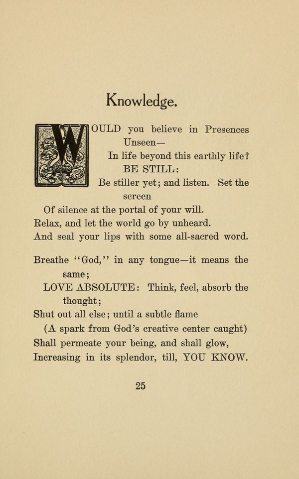 A Dialogue ~ The Weed ~ Strength ~ Affirm ~ The Chosen ~ The Nameless ~ The Word ~ Assistance ~ Credulity ~ Consciousness ~ The Structure ~ Our Souls ~ The Law ~ Knowledge ~ Give ~ Perfection ~ Fear ~ The Way ~ Understood ~ His Mansion ~ Effect ~ Three Things ~ Obstacles ~ Prayer ~ Climbing ~ "There Is No Death, There Are No Dead" ~ Realization ~ Contents -