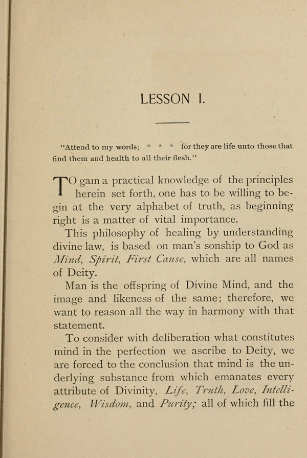 TO gain a practical knowledge of the principles herein set forth, one has to be willing to begin at the very alphabet of truth, as beginning right is a matter of vital importance. This philosophy of healing by understanding divine law, is based on man's sonship to God as Mind, Spirit, First Cause, which are all names of Deity.