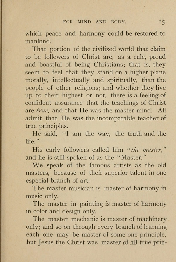 That portion of the civilized world that claim to be followers of Christ are, as a rule, proud and boastful of being Christians; that is, they seem to feel that they stand on a higher plane morally, intellectually and spiritually, than the people of other religions; and whether they live up to their highest or not, there is a feeling of confident assurance that the teachings of Christ are true, and that he was the master mind. All admit that he was the incomparable teacher of true principles.