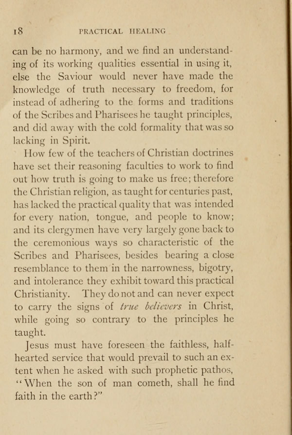 How few of the teachers of Christian doctrines have set their reasoning faculties to work to find out how truth is going to make us free; therefore the Christian religion, as taught for centuries past, has lacked the practical quality that was intended for every nation, tongue, and people to know; and its clergymen have very largely gone back to the ceremonious ways so characteristic of the Scribes and Pharisees, besides bearing a close resemblance to them in the narrowness, bigotry, and intolerance they exhibit toward this practical Christianity. They do not and can never expect to carry the signs of true believers in Christ, while going so contrary to the principles he taught.