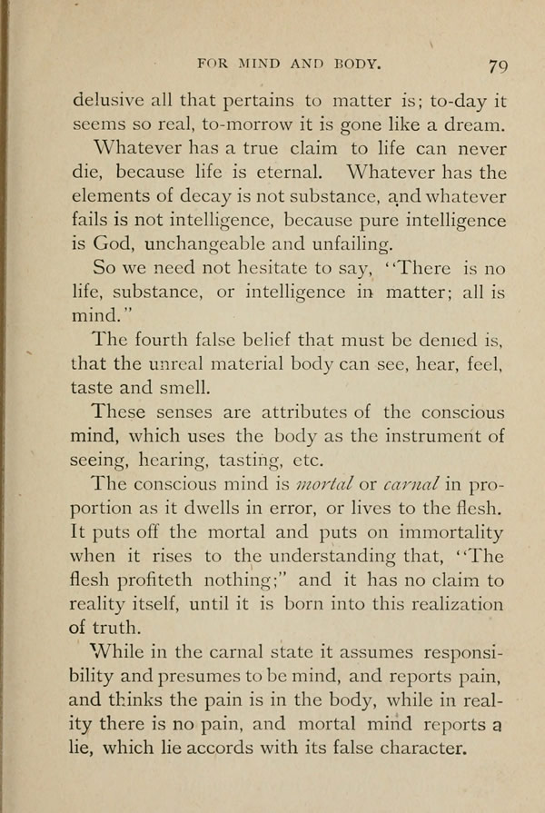 So we need not hesitate to say, "There is no life, substance, or intelligence in matter; all is mind."