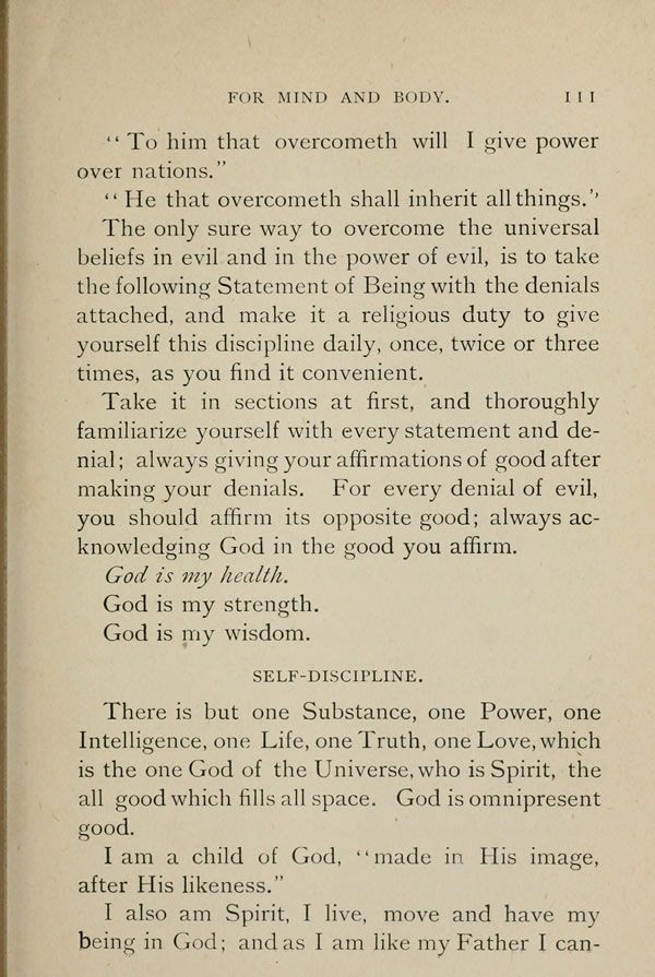 The only sure way to overcome the universal beliefs in evil and in the power of evil, is to take the following statement with the denials attached, and make it a religious duty to give yourself this discipline daily, once, twice or three times, as you find it convenient.