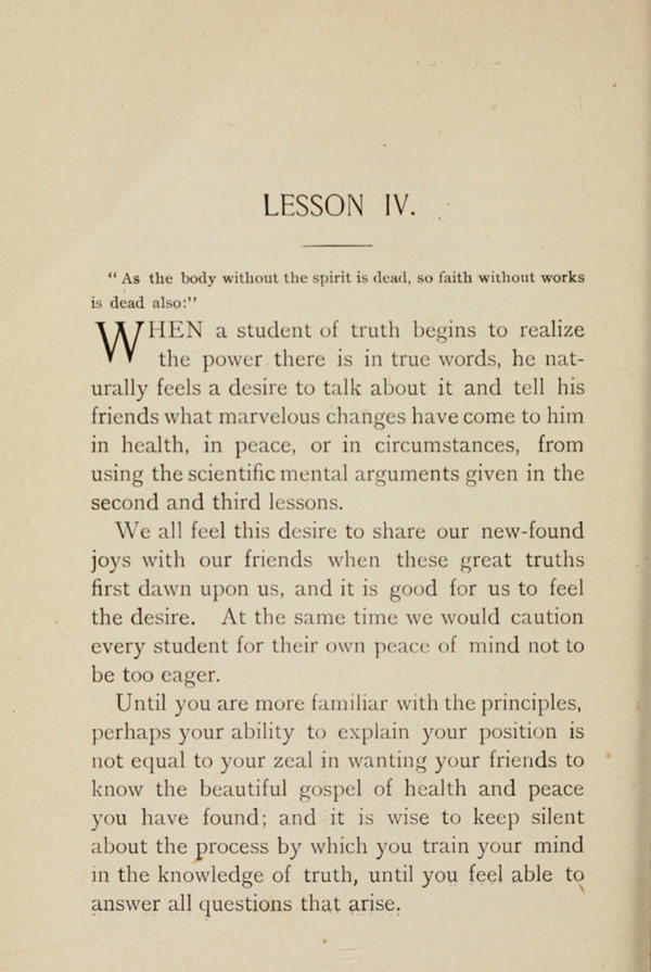 WHEN a student of truth begins to realize the power there is in true words, he naturally feels the desire to talk about it and tell his friends what marvelous changes have come to him in health, in peace, or in circumstances, from using the scientific mental arguments given in the second and third lessons.