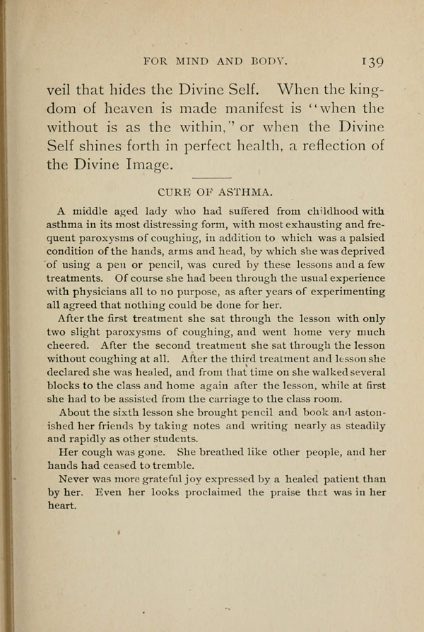 A middle aged lady who had suffered from childhood with asthma in its most distressing form, with most exhausting and frequent paroxysms of coughing, in addition to which was a palsied condition of the hands, arms and head, by which she was deprived of using a pen or pencil, was cured by these lessons and a few treatments. Of course she had been through the usual experience with physicians all to no purpose, as after years of experimenting all agreed that nothing could be done for her.