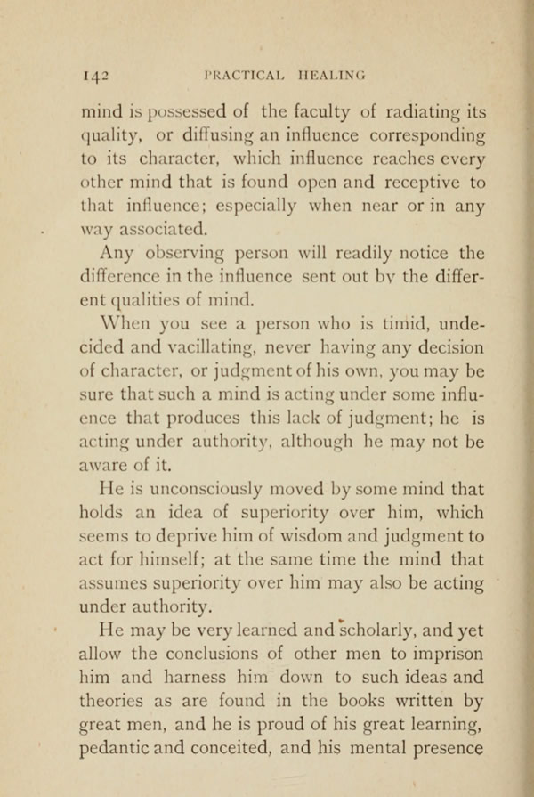 mind is possessed of the faculty of radiating its quality, or diffusing an influence corresponding to its character, which influence reaches every other mind that is found open and receptive to that influence; especially when near or in any way associated.