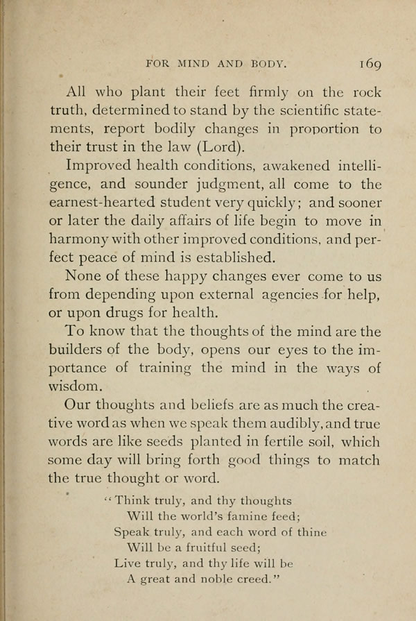 All who plant their feet firmly on the rock of truth, determined to stand by the scientific statements, report bodily changes in proportion to their trust in the law (Lord). Improved health conditions, awakened intelligence, and sounder judgment, all come to the earnest-hearted student very quickly; and sooner or later the daily affairs of life begin to move in harmony with other improved conditions, and perfect peace of mind is established. None of these happy changes ever come to us from depending upon external agencies for help, or upon drugs for health.