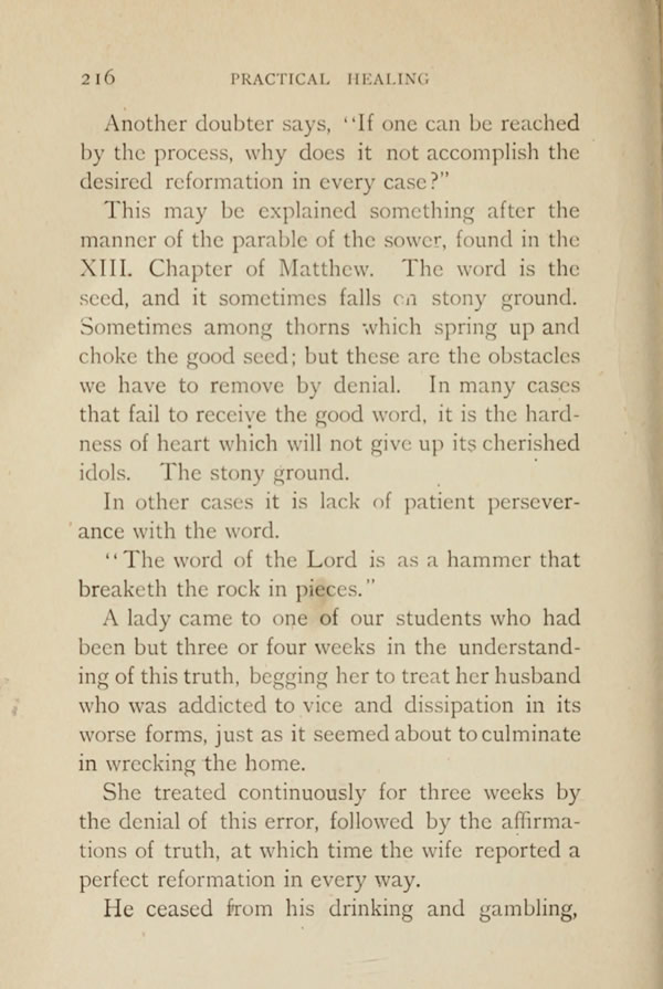 A lady came to one of our students who had been but three or four weeks in the understanding of this truth, begging her to treat her husband who was addicted to vice and dissipation in its worse forms, just as it seemed about to culminate in wrecking the home. She treated continuously for three weeks by the denial of this error, followed by the affirmation of truth, at which time the wife reported a perfect reformation in every way. He ceased from his drinking and gambling,