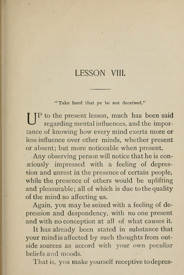 Up to the present lesson, much has been said regarding mental influences, and the importance of knowing how every mind exerts more or less influence over other minds, whether present or absent; but more noticeable when present.