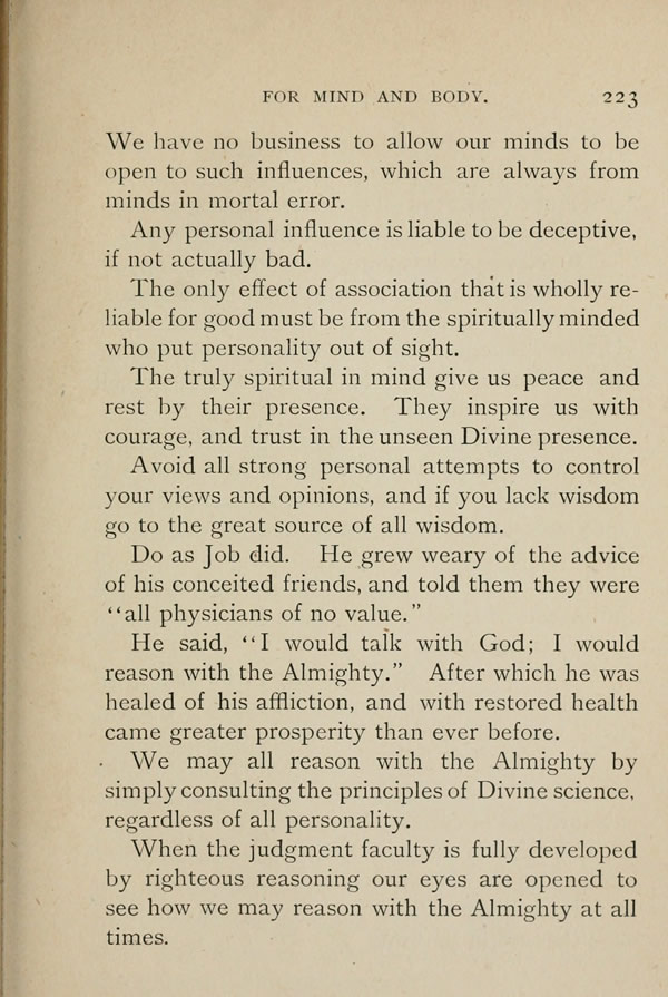 He said, "I would talk with God; I would reason with the Almighty." After which he was healed of his affliction, and with restored health came greater prosperity than ever before. We may all reason with the Almighty by simply consulting the principles of Divine Science, regardless of all personality.