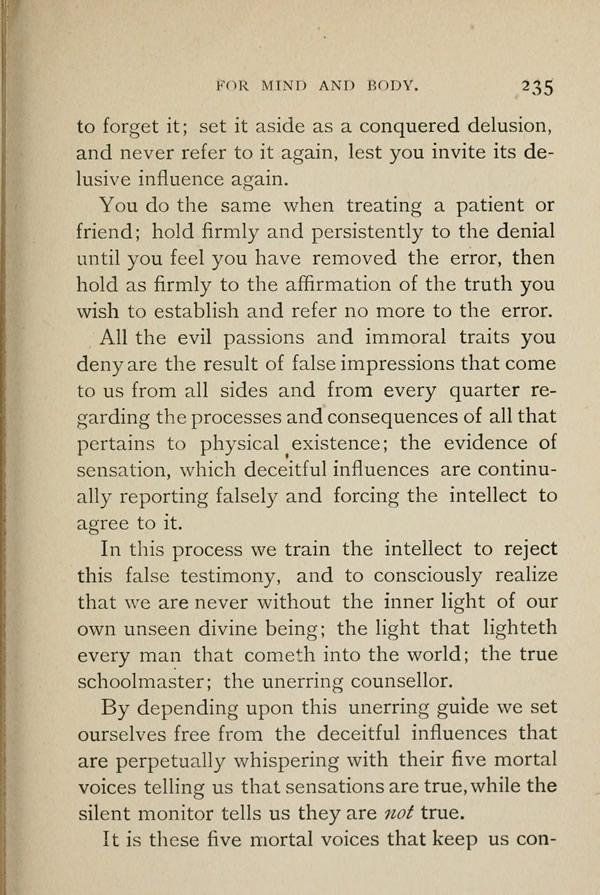 In this process we train the intellect to reject this false testimony, and to consciously realize that we are never without the inner light of our own unseen divine being; the light that lighteth every man that cometh into the world; the true schoolmaster; the unerring counselor. By depending upon this unerring guide we set ourselves free from the deceitful influences that are perpetually whispering with their five mortal voices telling us that sensations are true, while the silent monitor tells us they are not true.