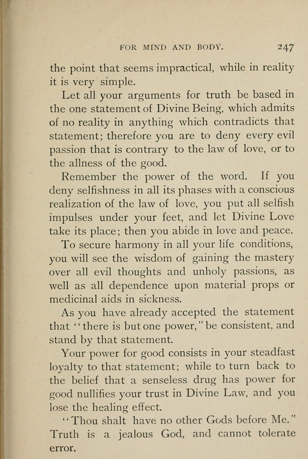 Let all your arguments for truth be based in the one statement of Divine Being, which admits of no reality in anything which contradicts that statement; therefore you are to deny every evil passion that is contrary to the law of love, or to the allness of the good. Remember the power of the word. If you deny selfishness in all its phases with a conscious realization of the law of love, you put all selfish impulses under your feet, and let Divine Love take its place; then you abide in love and peace.
