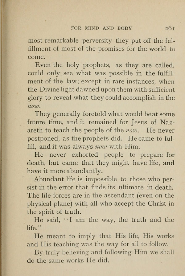 They generally foretold what would be at some future time, and it remained for Jesus of Nazareth to teach the people of the now. He never postponed, as the prophets did. He came to fulfill, and it was always now with Him.