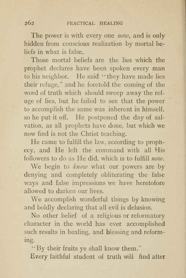 Those mortal beliefs are the lies which the prophet declares have been spoken every man to his neighbor. He said "they have made lies their refuge," and he foretold the coming of the word of truth which should sweep away the refuge of lies, but he failed to see that the power to accomplish the same was inherent in himself, so he put it off. He postponed the day of salvation, as all prophets have done, but which we now find is not the Christ teaching.