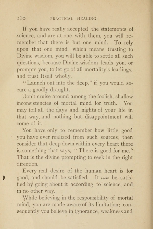If you have really accepted the statements of science, and are at one with them, you will remember that there is but one mind. To rely upon that one mind, which means trusting to Divine wisdom, you will be able to settle all such questions, because Divine wisdom leads you, or prompts you, to let go of all mortality's leadings, and trust Itself wholly.
