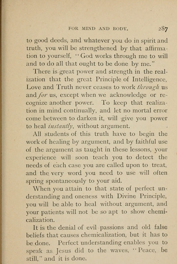 When you attain to that state of perfect understanding and oneness with Divine Principle, you will be able to heal without argument, and your patients will not be so apt to show chemicalization.