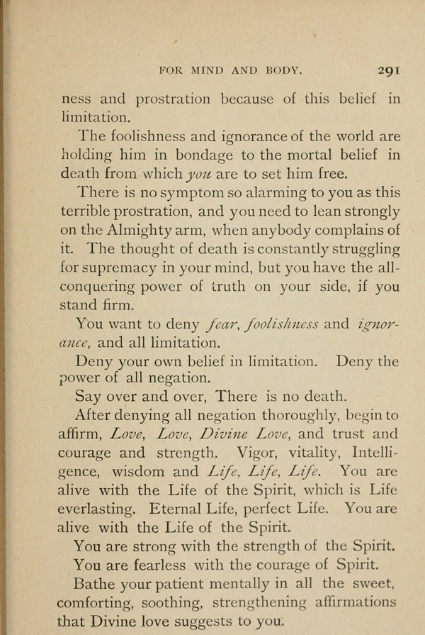 After denying all negation thoroughly, begin to affirm; Love, Love, Divine Love, and trust and courage and strength. Vigor, vitality, Intelligence, wisdom and Life, Life, Life. You are alive with the Life of Spirit, which is Life everlasting. Eternal Life, perfect Life. You are alive with the Life of the Spirit.