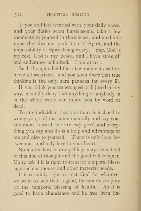 If you still feel wearied with your daily cares, and your duties seem burdensome, take a few moments to yourself in the silence, and meditate upon the absolute perfection of Spirit, and the impossibility of Spirit being weary.