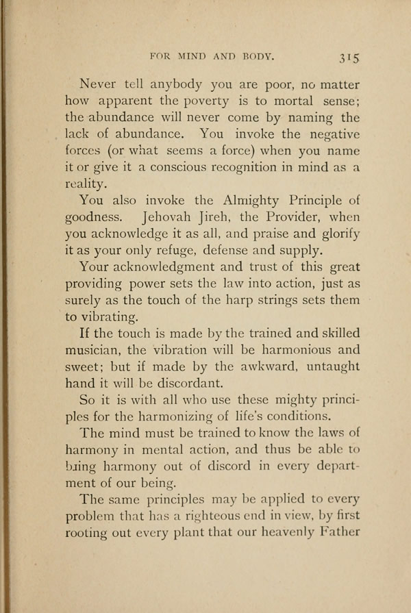You also invoke the Almighty Principle of goodness, Jehovah Jireh, the Provider, when you acknowledge it as all, and praise and glorify it as your only refuge, defense and supply, Your acknowledgment and trust of this great providing power sets the law into action, just as surely as the touch of the harp strings sets them to vibrating.