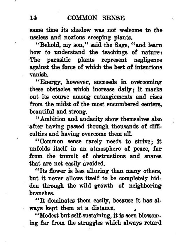 Announcement - Preface - Common Sense: What Is It? - The Fight Against Illusion - The Development of the Reasoning Power - Common Sense and Impulse - The Dangers of Sentimentality - The Utility of Common Sense in Daily Life - Power of Deduction - How to Acquire Common Sense - Common Sense and Action - The Most Thorough Business Man - Common Sense and Self-Control - Common Sense Does Not Exclude Great Aspirations - Contents -