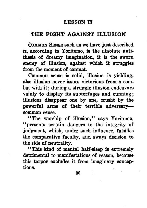 Common Sense such as we have just described it, according to Yoritomo, is the absolute antithesis of dreamy imagination, it is the sworn enemy of illusion, against which it struggles from the moment of contact.