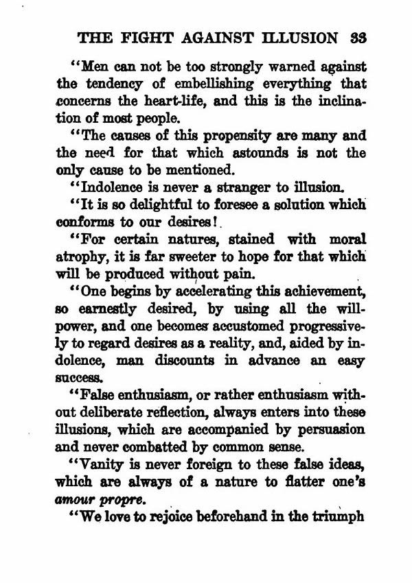"One begins by accelerating this achievement, so earnestly desired, by using all the will-power, and one becomes accustomed progressively to regard desires as a reality, and, aided by indolence, man discounts in advance an easy success.