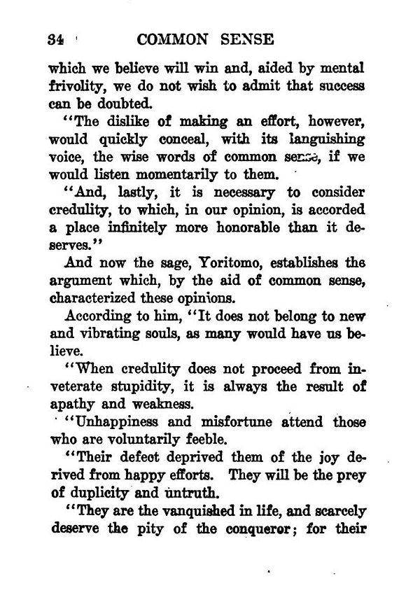 Announcement - Preface - Common Sense: What Is It? - The Fight Against Illusion - The Development of the Reasoning Power - Common Sense and Impulse - The Dangers of Sentimentality - The Utility of Common Sense in Daily Life - Power of Deduction - How to Acquire Common Sense - Common Sense and Action - The Most Thorough Business Man - Common Sense and Self-Control - Common Sense Does Not Exclude Great Aspirations - Contents -