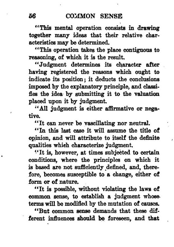 Announcement - Preface - Common Sense: What Is It? - The Fight Against Illusion - The Development of the Reasoning Power - Common Sense and Impulse - The Dangers of Sentimentality - The Utility of Common Sense in Daily Life - Power of Deduction - How to Acquire Common Sense - Common Sense and Action - The Most Thorough Business Man - Common Sense and Self-Control - Common Sense Does Not Exclude Great Aspirations - Contents -