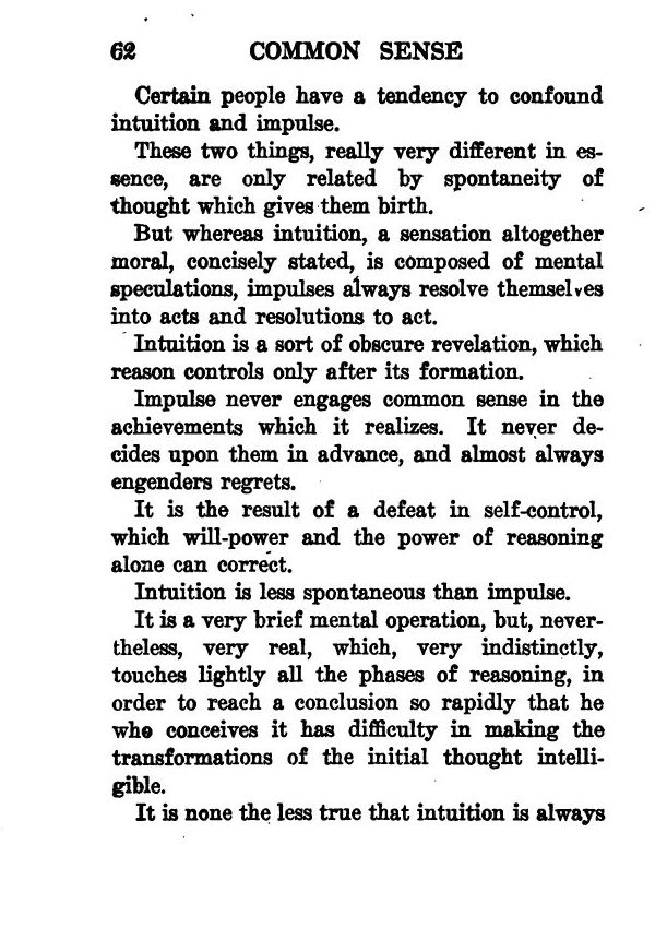 Announcement - Preface - Common Sense: What Is It? - The Fight Against Illusion - The Development of the Reasoning Power - Common Sense and Impulse - The Dangers of Sentimentality - The Utility of Common Sense in Daily Life - Power of Deduction - How to Acquire Common Sense - Common Sense and Action - The Most Thorough Business Man - Common Sense and Self-Control - Common Sense Does Not Exclude Great Aspirations - Contents -