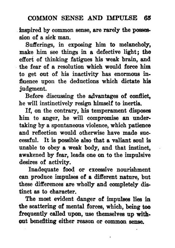 The most evident danger of impulses lies in the scattering of mental forces, which, being too frequently called upon, use themselves up without benefiting either reason or common sense.