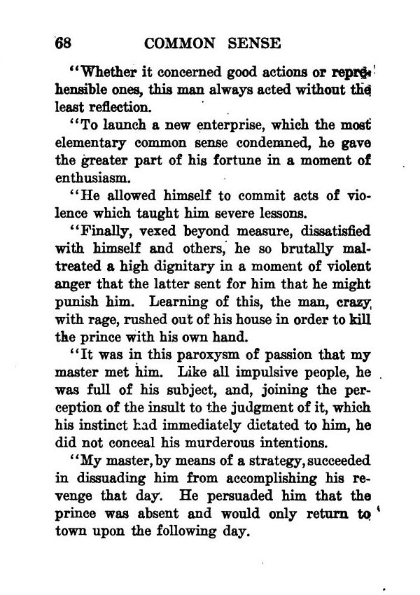 "It was in this paroxysm of passion that my master met him. Like all impulsive people, he was full of his subject, and, joining the perception of the insult to the judgment of it, which his instinct had immediately dictated to him, he did not conceal his murderous intentions.