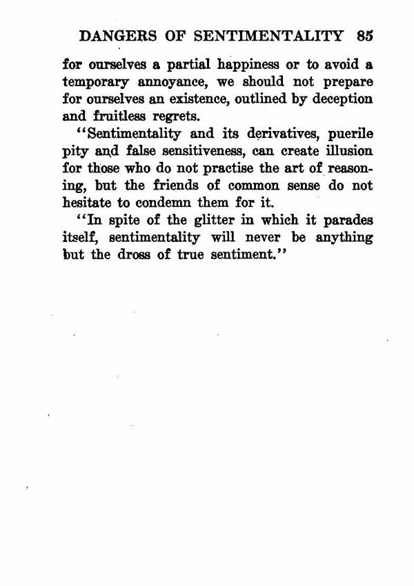 "Sentimentality and its derivatives, puerile pity and false sensitiveness, can create illusion for those who do not practise the art of reasoning, but the friends of common sense do not hesitate to condemn them for it.