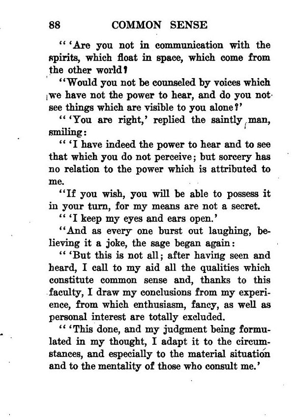 "'But this is not all; after having seen and heard, I call to my aid all the qualities which constitute common sense and, thanks to this faculty, I draw my conclusions from my experience, from which enthusiasm, fancy, as well as personal interest are totally excluded.