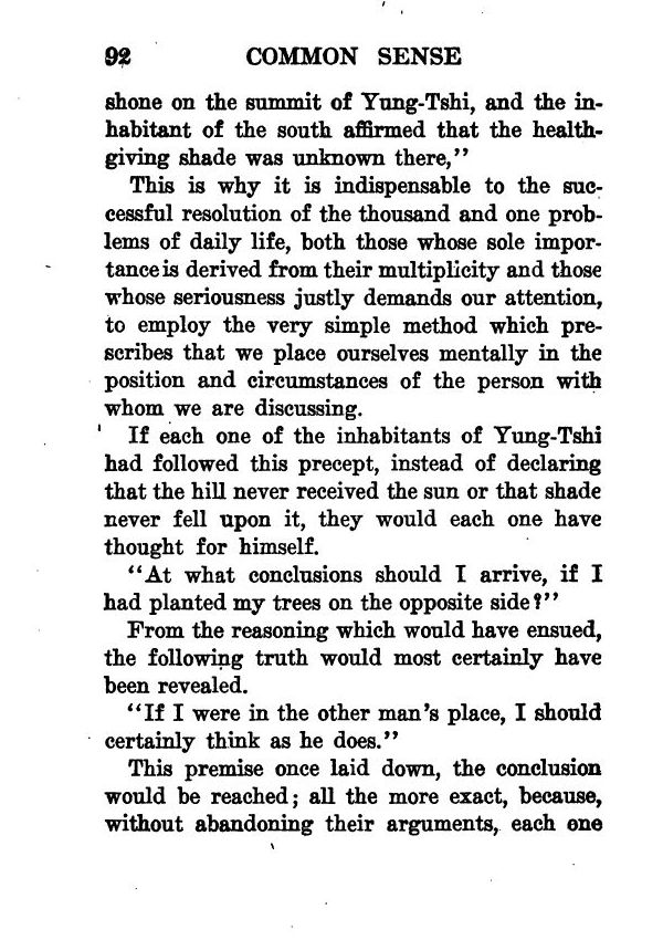 If each one of the inhabitants of Yung-Tshi had followed this precept, instead of declaring that the hill never received the sun or that shade never fell upon it, they would each one have thought for himself.