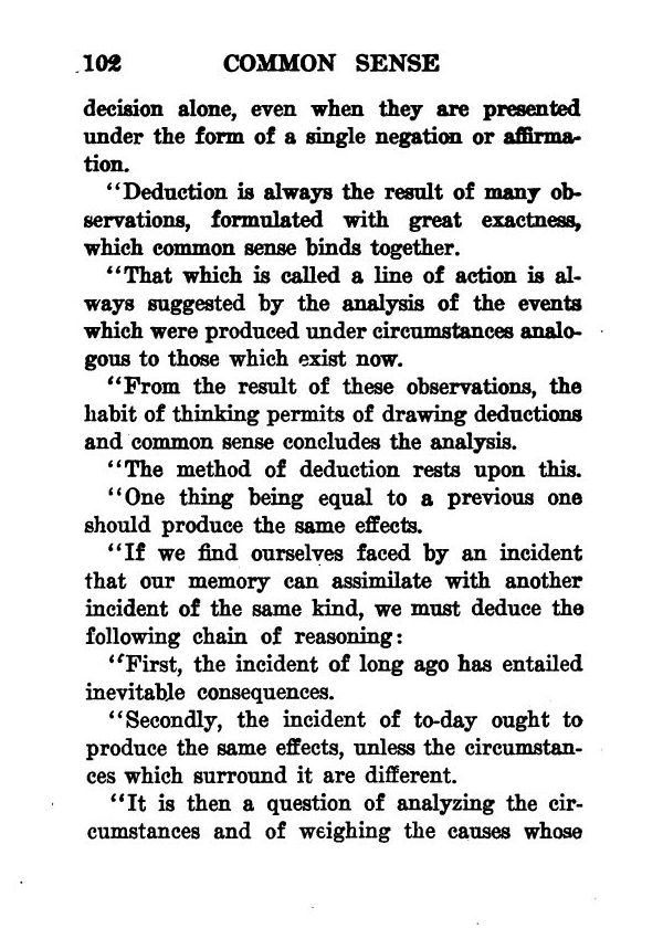 "From the result of these observations, the habit of thinking permits of drawing deductions and common sense concludes the analysis.