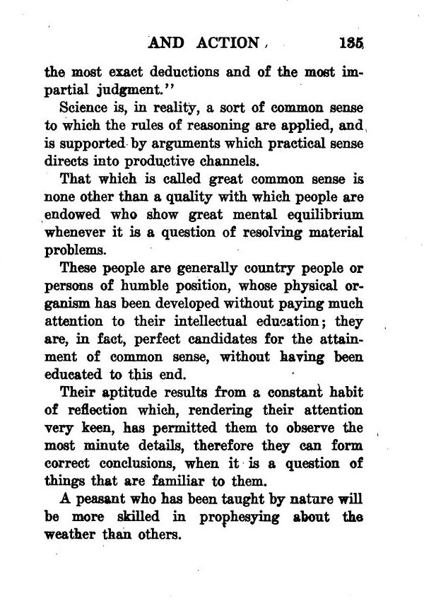 These people are generally country people or persons of humble position, whose physical organism has been developed without paying much attention to their intellectual education; they are, in fact, perfect candidates for the attainment of common sense, without having been educated to this end.