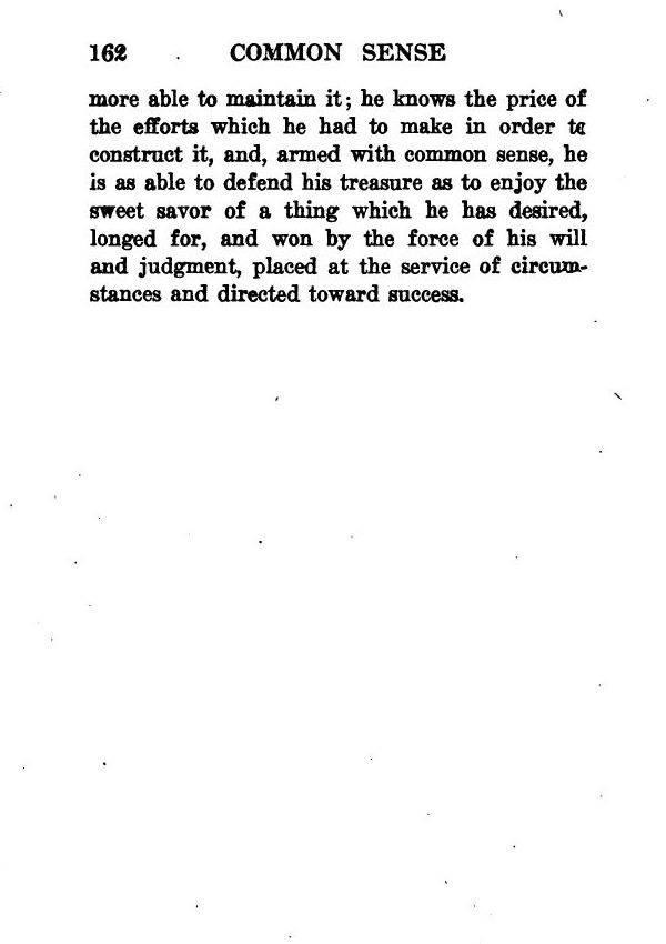 Announcement - Preface - Common Sense: What Is It? - The Fight Against Illusion - The Development of the Reasoning Power - Common Sense and Impulse - The Dangers of Sentimentality - The Utility of Common Sense in Daily Life - Power of Deduction - How to Acquire Common Sense - Common Sense and Action - The Most Thorough Business Man - Common Sense and Self-Control - Common Sense Does Not Exclude Great Aspirations - Contents -