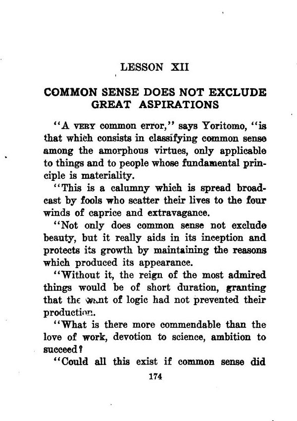 "A very common error," says Yoritomo, "is that which consists in classifying common sense among the amorphous virtues, only applicable to things and to people whose fundamental principle is materiality.